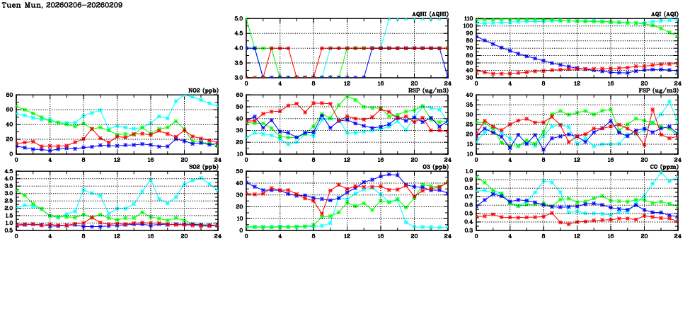 | Air Quality Data Time Series in Tuen Mun (2026/02/09) | ( Line colors: Day -3 Day -2 Day -1 Current day ) | 2D Map Current AQHI |