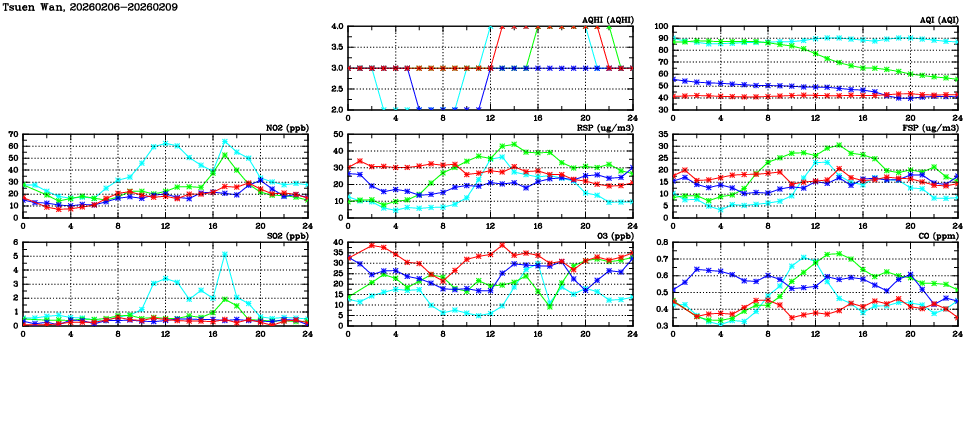 | Air Quality Data Time Series in Tsuen Wan (2026/02/09) | ( Line colors: Day -3 Day -2 Day -1 Current day ) | 2D Map Current AQHI |