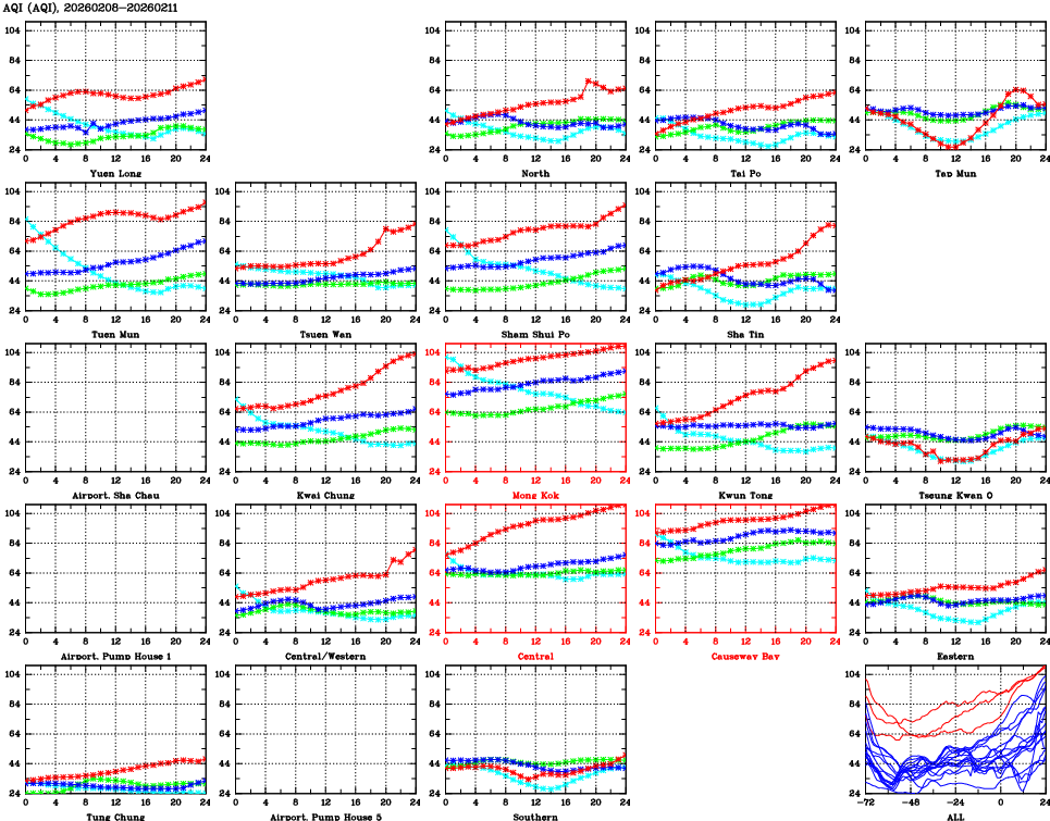 | Air Quality Data Time Series for AQI (2026/02/11) | ( Line colors: Day -3 Day -2 Day -1 Current day ) | 2D Map Current AQHI |