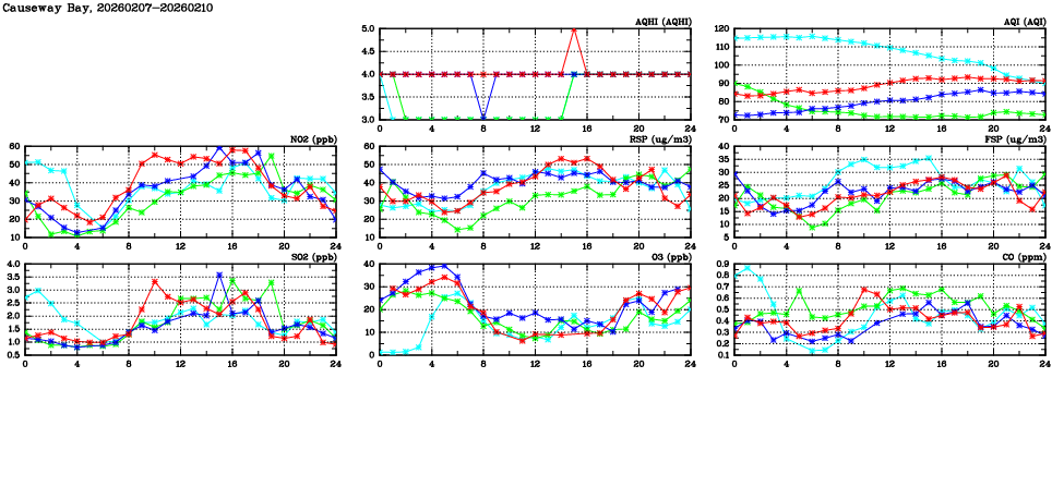 | Air Quality Data Time Series in Causeway Bay (2026/02/10) | ( Line colors: Day -3 Day -2 Day -1 Current day ) | 2D Map Current AQHI |