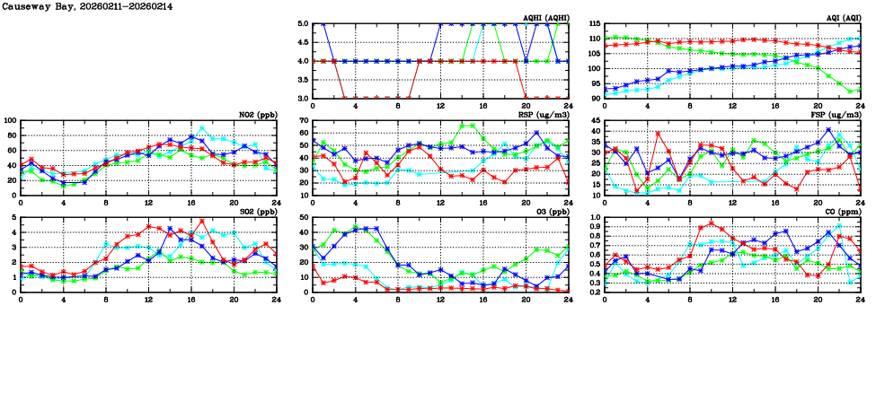 | Air Quality Data Time Series in Causeway Bay (2026/02/14) | ( Line colors: Day -3 Day -2 Day -1 Current day ) | 2D Map Current AQHI |