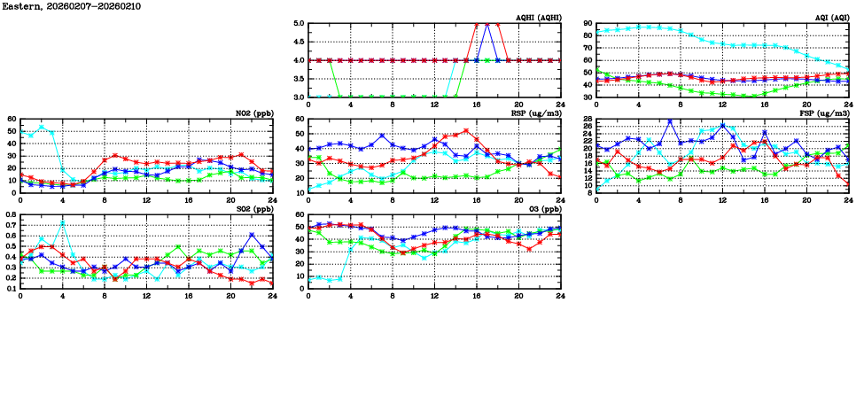 | Air Quality Data Time Series in Eastern (2026/02/10) | ( Line colors: Day -3 Day -2 Day -1 Current day ) | 2D Map Current AQHI |