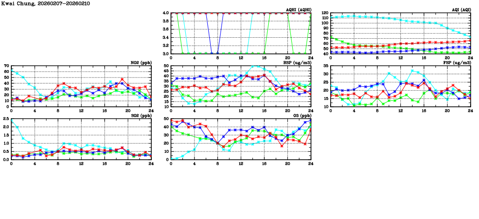 | Air Quality Data Time Series in Kwai Chung (2026/02/10) | ( Line colors: Day -3 Day -2 Day -1 Current day ) | 2D Map Current AQHI |