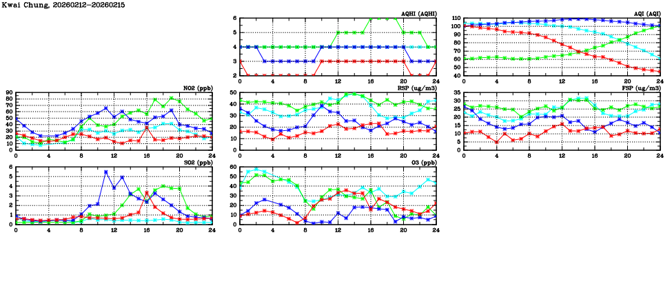 | Air Quality Data Time Series in Kwai Chung (2026/02/15) | ( Line colors: Day -3 Day -2 Day -1 Current day ) | 2D Map Current AQHI |