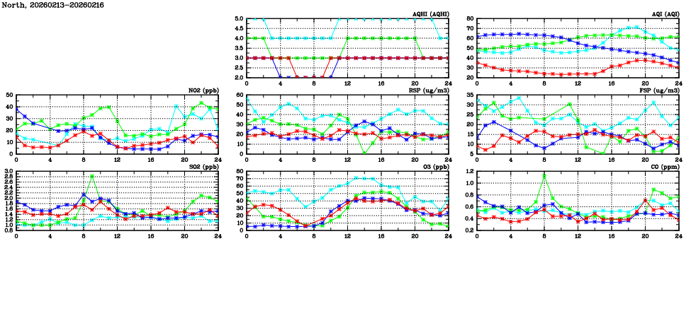 | Air Quality Data Time Series in North (2026/02/16) | ( Line colors: Day -3 Day -2 Day -1 Current day ) | 2D Map Current AQHI |