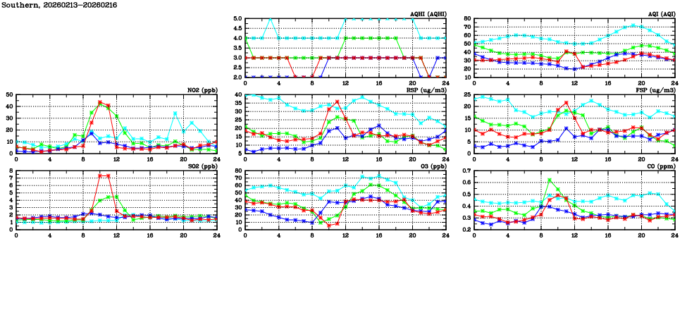 | Air Quality Data Time Series in Southern (2026/02/16) | ( Line colors: Day -3 Day -2 Day -1 Current day ) | 2D Map Current AQHI |