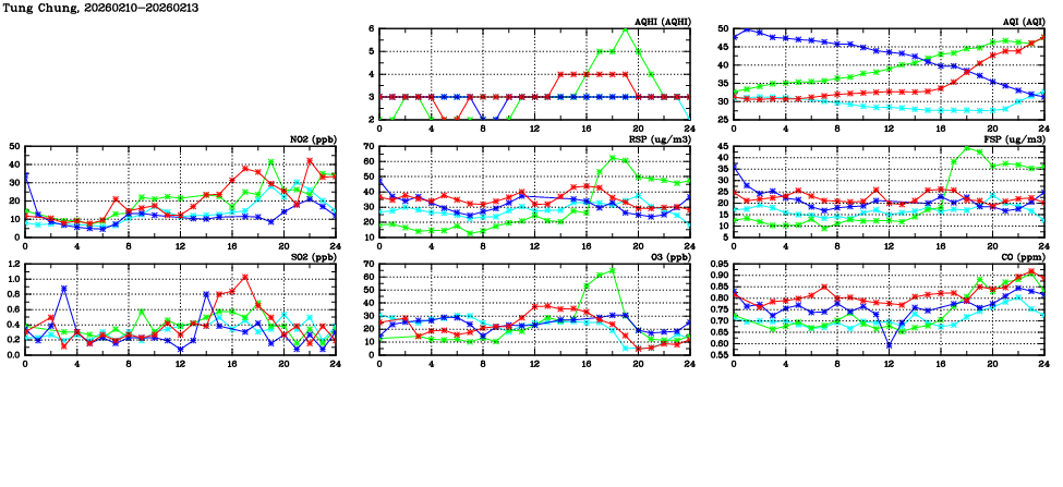 | Air Quality Data Time Series in Tung Chung (2026/02/13) | ( Line colors: Day -3 Day -2 Day -1 Current day ) | 2D Map Current AQHI |