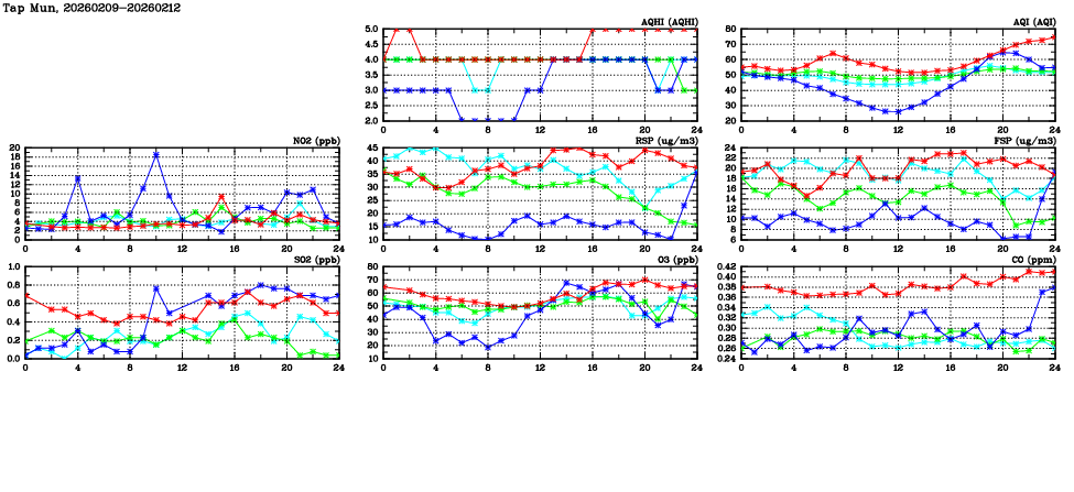 | Air Quality Data Time Series in Tap Mun (2026/02/12) | ( Line colors: Day -3 Day -2 Day -1 Current day ) | 2D Map Current AQHI |