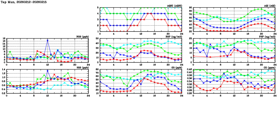 | Air Quality Data Time Series in Tap Mun (2026/02/15) | ( Line colors: Day -3 Day -2 Day -1 Current day ) | 2D Map Current AQHI |