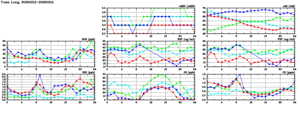 | Air Quality Data Time Series in Yuen Long (2026/02/15) | ( Line colors: Day -3 Day -2 Day -1 Current day ) | 2D Map Current AQHI |