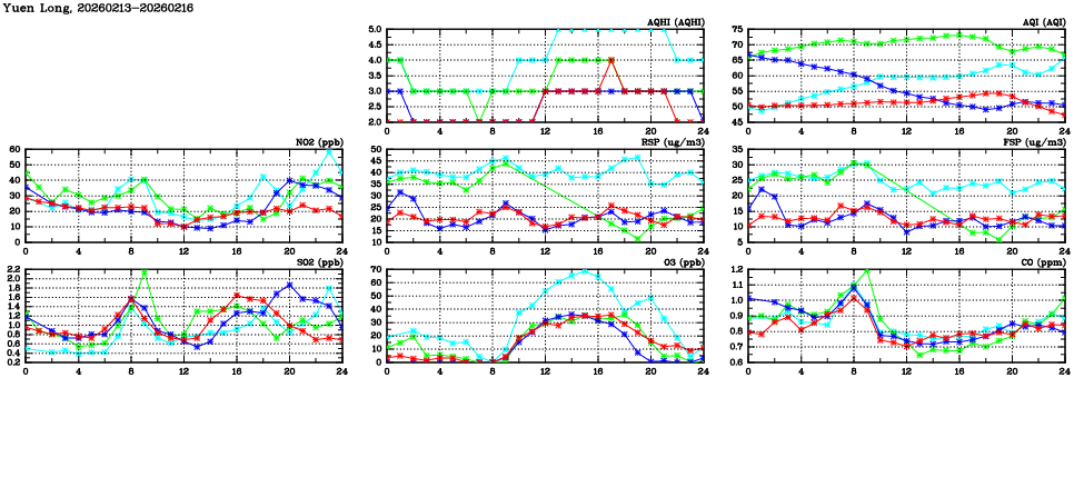 | Air Quality Data Time Series in Yuen Long (2026/02/16) | ( Line colors: Day -3 Day -2 Day -1 Current day ) | 2D Map Current AQHI |