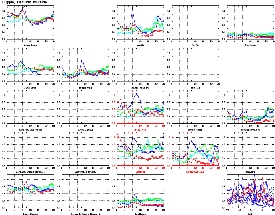 | Air Quality Data Time Series for CO (2026/02/15) | ( Line colors: Day -3 Day -2 Day -1 Current day ) | 2D Map Current AQHI |