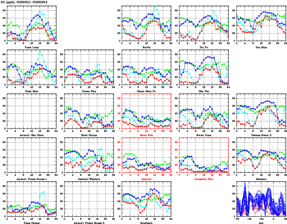| Air Quality Data Time Series for O3 (2026/02/14) | ( Line colors: Day -3 Day -2 Day -1 Current day ) | 2D Map Current AQHI |
