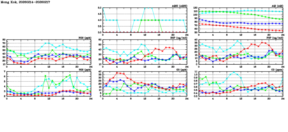 | Air Quality Data Time Series in Mong Kok (2026/02/17) | ( Line colors: Day -3 Day -2 Day -1 Current day ) | 2D Map Current AQHI |