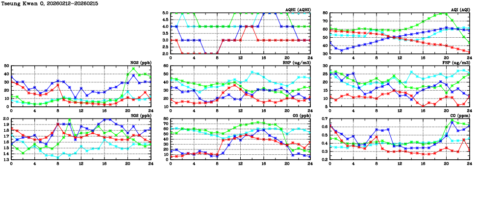 | Air Quality Data Time Series in Tseung Kwan O (2026/02/15) | ( Line colors: Day -3 Day -2 Day -1 Current day ) | 2D Map Current AQHI |