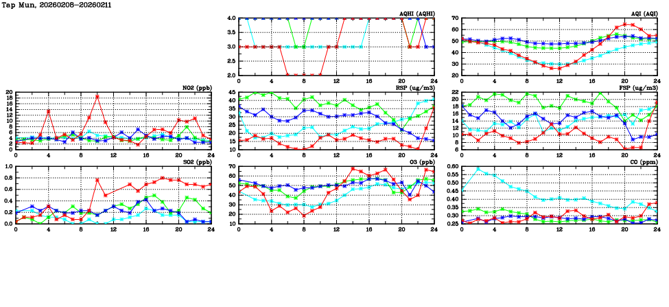 | Air Quality Data Time Series in Tap Mun (2026/02/11) | ( Line colors: Day -3 Day -2 Day -1 Current day ) | 2D Map Current AQHI |
