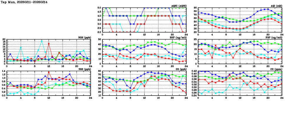 | Air Quality Data Time Series in Tap Mun (2026/02/14) | ( Line colors: Day -3 Day -2 Day -1 Current day ) | 2D Map Current AQHI |