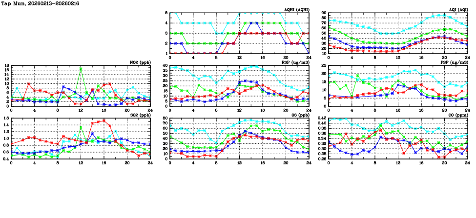 | Air Quality Data Time Series in Tap Mun (2026/02/16) | ( Line colors: Day -3 Day -2 Day -1 Current day ) | 2D Map Current AQHI |