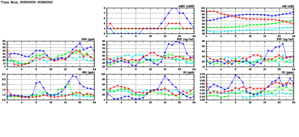 | Parameters: | AQHI | AQI | RSP | FSP | NO2 | SO2 | O3 | CO | Temp | WS | WD |