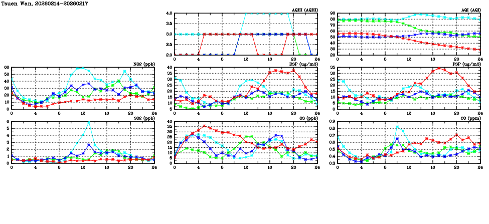 | Air Quality Data Time Series in Tsuen Wan (2026/02/17) | ( Line colors: Day -3 Day -2 Day -1 Current day ) | 2D Map Current AQHI |