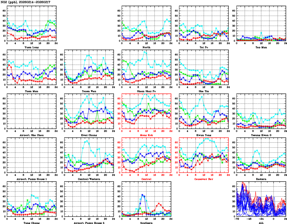 | Air Quality Data Time Series for NO2 (2026/02/17) | ( Line colors: Day -3 Day -2 Day -1 Current day ) | 2D Map Current AQHI |