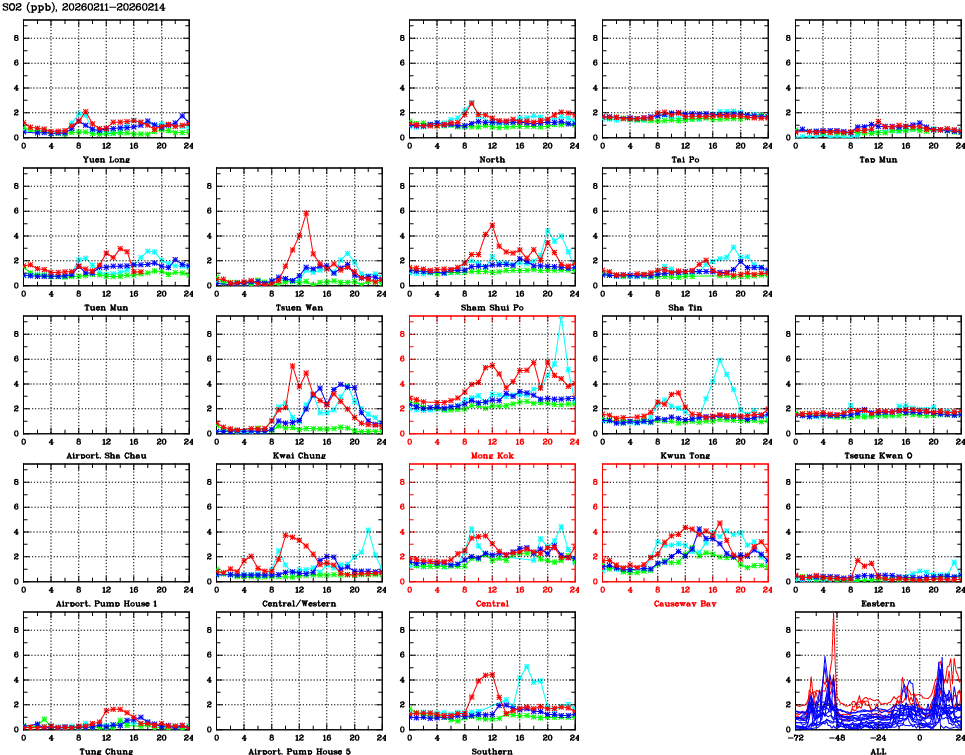 | Air Quality Data Time Series for SO2 (2026/02/14) | ( Line colors: Day -3 Day -2 Day -1 Current day ) | 2D Map Current AQHI |