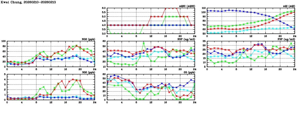 | Air Quality Data Time Series in Kwai Chung (2026/02/13) | ( Line colors: Day -3 Day -2 Day -1 Current day ) | 2D Map Current AQHI |