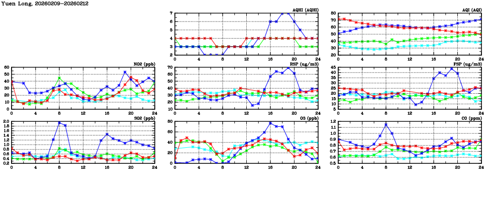 | Air Quality Data Time Series in Yuen Long (2026/02/12) | ( Line colors: Day -3 Day -2 Day -1 Current day ) | 2D Map Current AQHI |