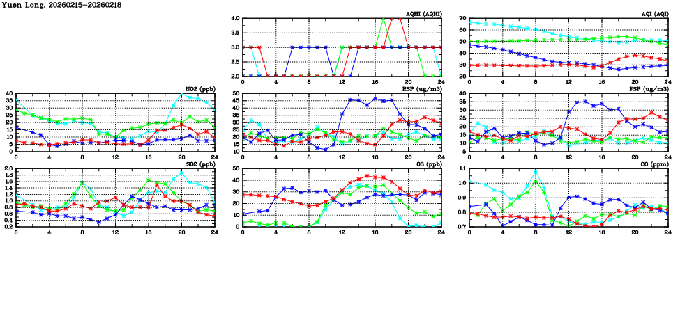 | Air Quality Data Time Series in Yuen Long (2026/02/18) | ( Line colors: Day -3 Day -2 Day -1 Current day ) | 2D Map Current AQHI |