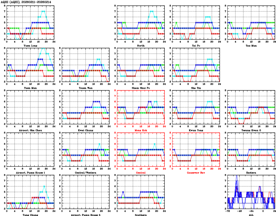 | Air Quality Data Time Series for AQHI (2026/02/14) | ( Line colors: Day -3 Day -2 Day -1 Current day ) | 2D Map Current AQHI |