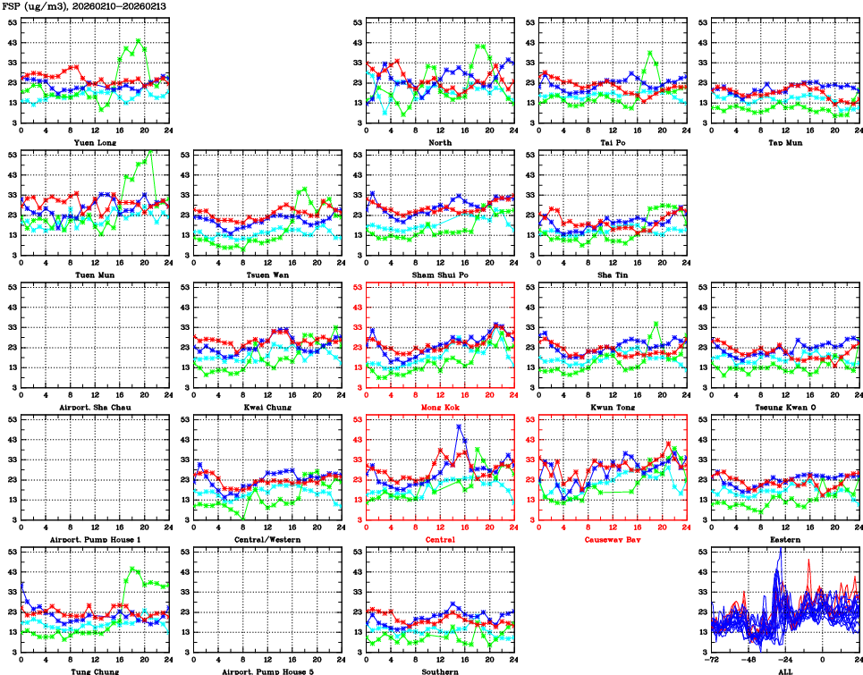 | Air Quality Data Time Series for FSP (2026/02/13) | ( Line colors: Day -3 Day -2 Day -1 Current day ) | 2D Map Current AQHI |
