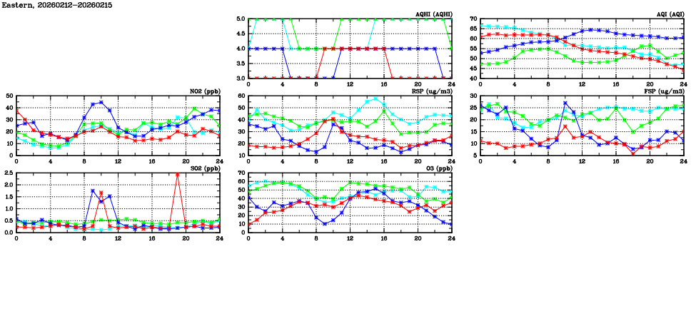 | Air Quality Data Time Series in Eastern (2026/02/15) | ( Line colors: Day -3 Day -2 Day -1 Current day ) | 2D Map Current AQHI |