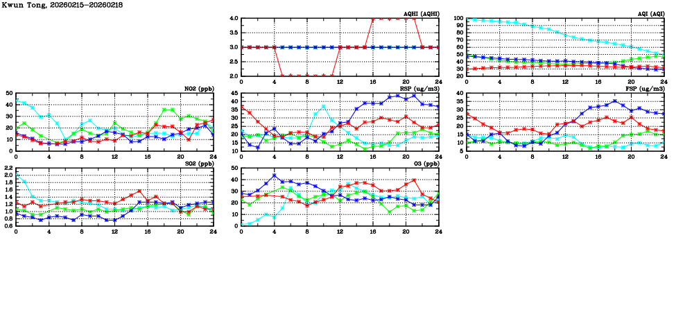 | Air Quality Data Time Series in Kwun Tong (2026/02/18) | ( Line colors: Day -3 Day -2 Day -1 Current day ) | 2D Map Current AQHI |
