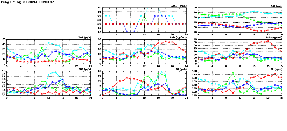 | Air Quality Data Time Series in Tung Chung (2026/02/17) | ( Line colors: Day -3 Day -2 Day -1 Current day ) | 2D Map Current AQHI |