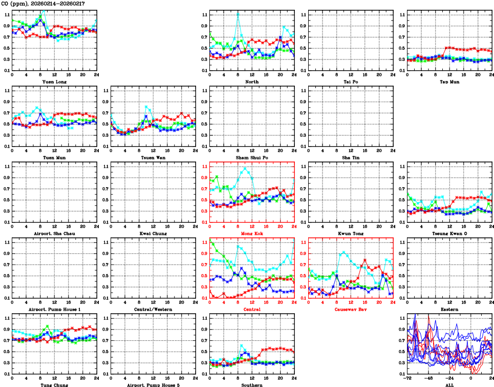 | Air Quality Data Time Series for CO (2026/02/17) | ( Line colors: Day -3 Day -2 Day -1 Current day ) | 2D Map Current AQHI |