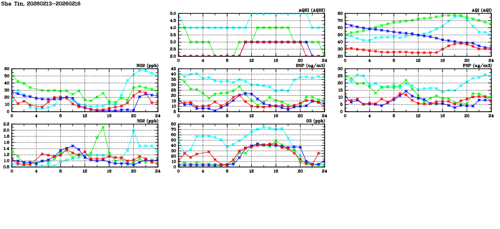 | Air Quality Data Time Series in Sha Tin (2026/02/16) | ( Line colors: Day -3 Day -2 Day -1 Current day ) | 2D Map Current AQHI |