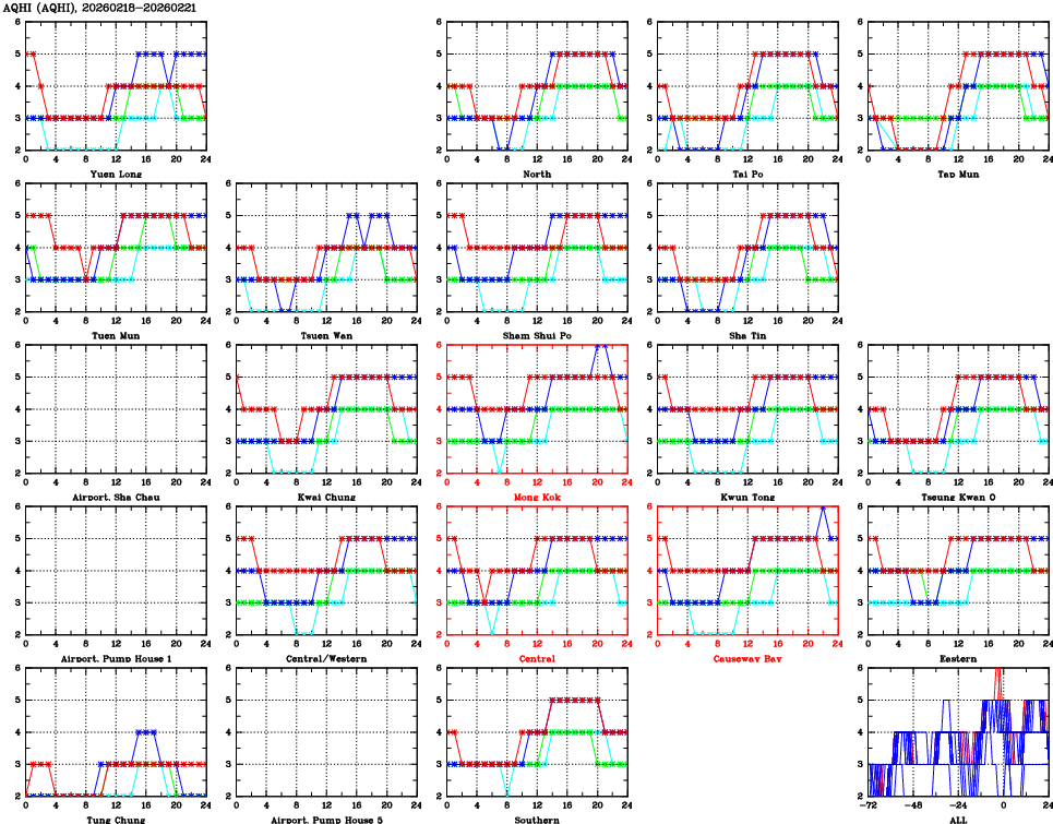 | Air Quality Data Time Series for AQHI (2026/02/21) | ( Line colors: Day -3 Day -2 Day -1 Current day ) | 2D Map Current AQHI |
