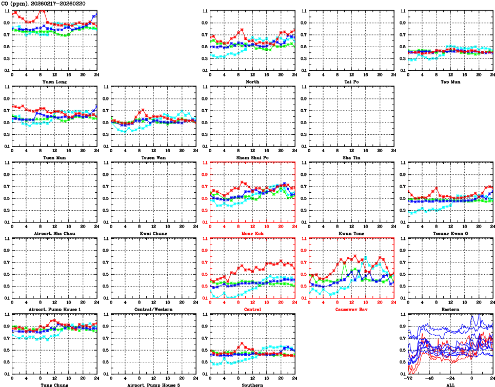| Air Quality Data Time Series for CO (2026/02/20) | ( Line colors: Day -3 Day -2 Day -1 Current day ) | 2D Map Current AQHI |