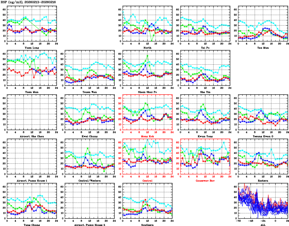 | Air Quality Data Time Series for RSP (2026/02/16) | ( Line colors: Day -3 Day -2 Day -1 Current day ) | 2D Map Current AQHI |
