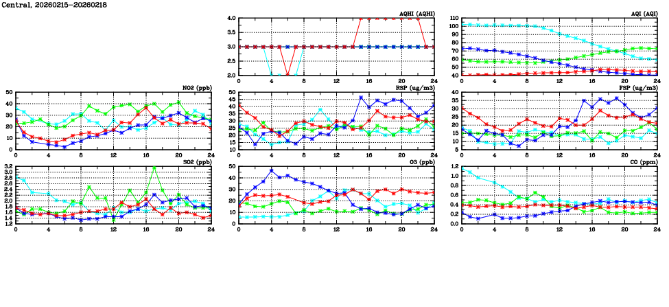 | Air Quality Data Time Series in Central (2026/02/18) | ( Line colors: Day -3 Day -2 Day -1 Current day ) | 2D Map Current AQHI |