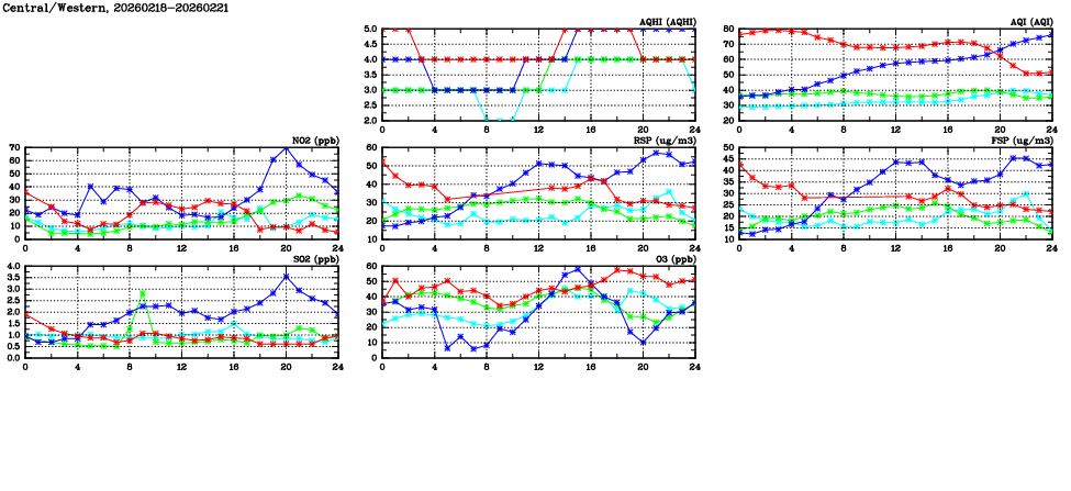 | Air Quality Data Time Series in Central/Western (2026/02/21) | ( Line colors: Day -3 Day -2 Day -1 Current day ) | 2D Map Current AQHI |