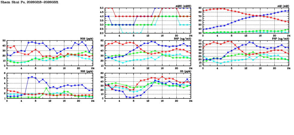 | Air Quality Data Time Series in Sham Shui Po (2026/02/21) | ( Line colors: Day -3 Day -2 Day -1 Current day ) | 2D Map Current AQHI |