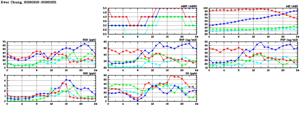 | Air Quality Data Time Series in Kwai Chung (2026/02/21) | ( Line colors: Day -3 Day -2 Day -1 Current day ) | 2D Map Current AQHI |