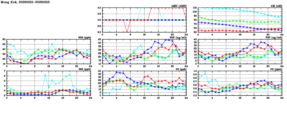 | Air Quality Data Time Series in Mong Kok (2026/02/18) | ( Line colors: Day -3 Day -2 Day -1 Current day ) | 2D Map Current AQHI |