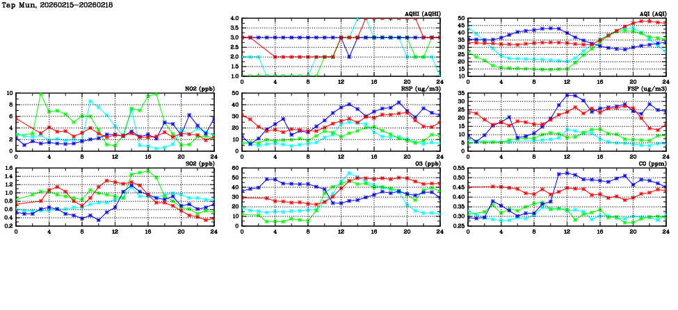 | Air Quality Data Time Series in Tap Mun (2026/02/18) | ( Line colors: Day -3 Day -2 Day -1 Current day ) | 2D Map Current AQHI |