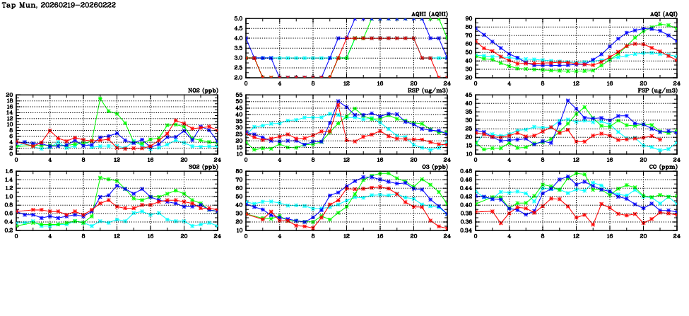 | Air Quality Data Time Series in Tap Mun (2026/02/22) | ( Line colors: Day -3 Day -2 Day -1 Current day ) | 2D Map Current AQHI |