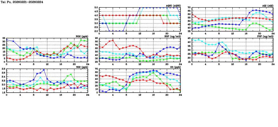 | Air Quality Data Time Series in Tai Po (2026/02/24) | ( Line colors: Day -3 Day -2 Day -1 Current day ) | 2D Map Current AQHI |