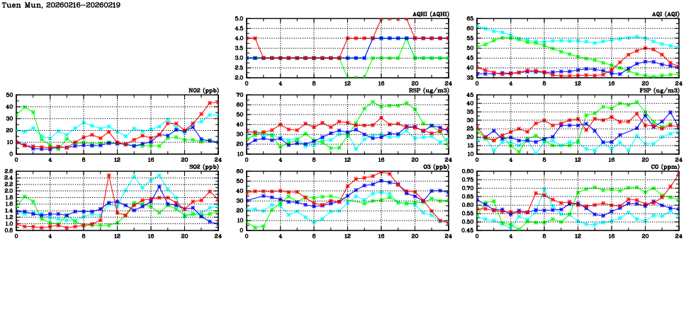 | Air Quality Data Time Series in Tuen Mun (2026/02/19) | ( Line colors: Day -3 Day -2 Day -1 Current day ) | 2D Map Current AQHI |
