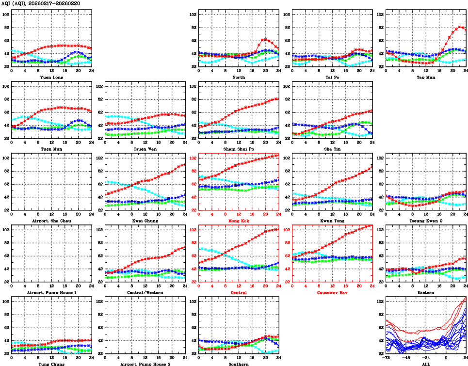 | Air Quality Data Time Series for AQI (2026/02/20) | ( Line colors: Day -3 Day -2 Day -1 Current day ) | 2D Map Current AQHI |