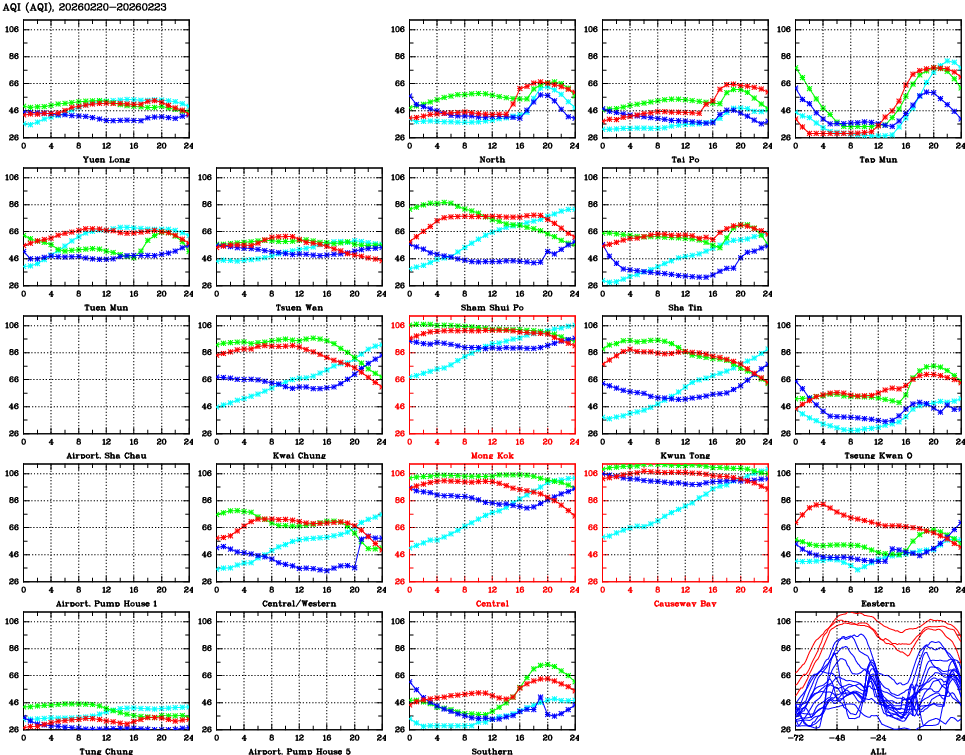 | Air Quality Data Time Series for AQI (2026/02/23) | ( Line colors: Day -3 Day -2 Day -1 Current day ) | 2D Map Current AQHI |